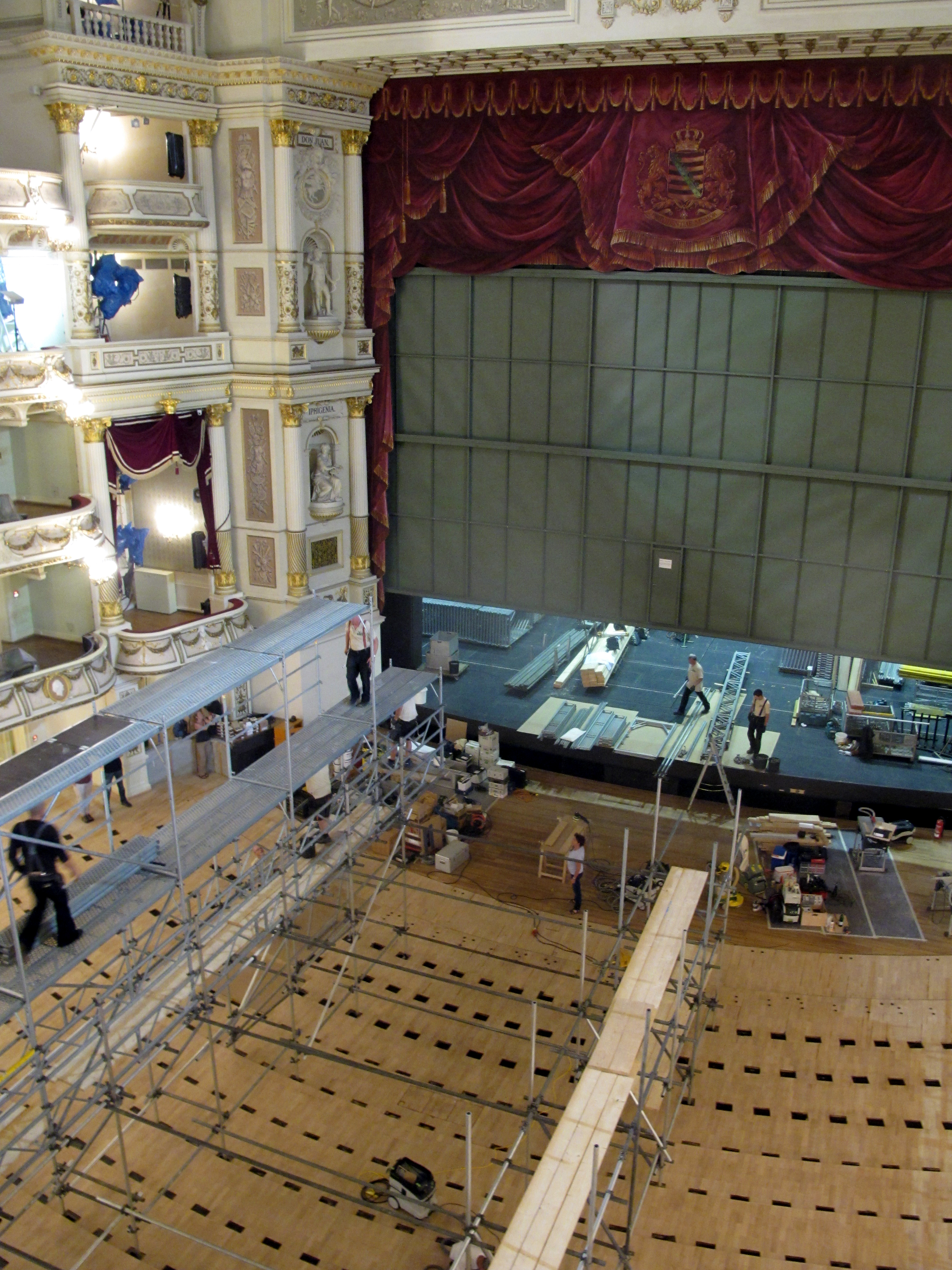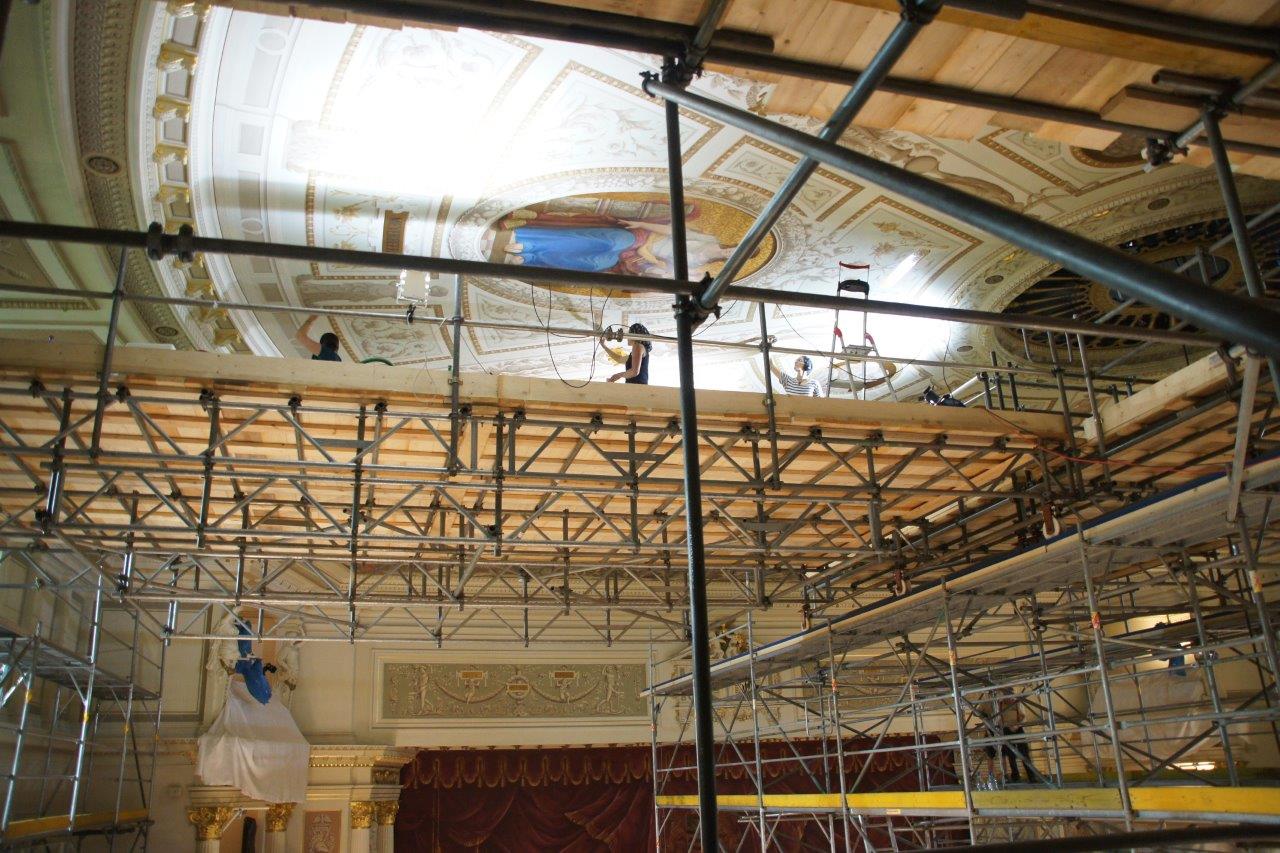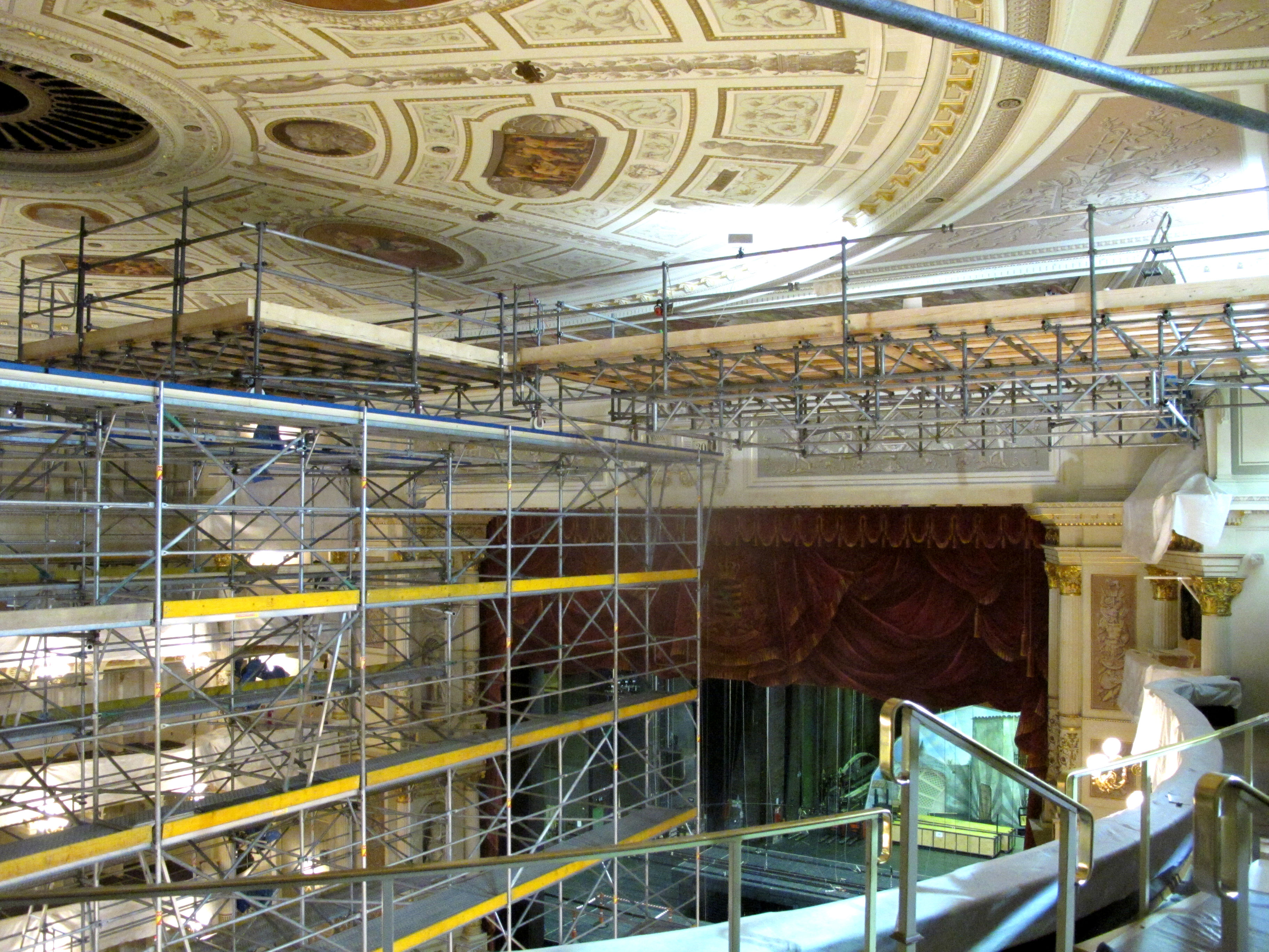 systemungebundene Stahl-Rohr-Kupplung Gerüstkonstruktion im Druckraum als Traggerüst durch die vorhandenen Stuhlöffnungen zur Aufnahme der Gitterträgerbrücken. Ausbau und Erweiterung dieser mit einem systemgebundenen, ausgeschraubten Leergerüst bis ca.2,00m unter die Decke zur Aufnahme von fahrbaren und festen Gerüstebenen mit umlaufenden, dreiteiligem Seitenschutz auf diesem. Stahl-Rohr Konstruktionen, auf dem 4.Rang umlaufend, als Raumgerüst mit Plattform, zum Anpassen der Kubatur und zur Aufnahme der fahrbaren Plattformen. Der Zugang zu den Gerüstebenen erfolgt über den 4. und 5.Rang. Im Bereich der Mittelloge wird die Konstruktion erweitert und ein Leitergang vorgesehen. Die systemungebundenen, fahrbaren Gerüsteben aus einer ausgeschraubten Gitterträgerkonstruktion und einem dichten, doppeltem Holzbelag werden zusätzlich mit Hartfaserplatten verklebt, ausgelegt.