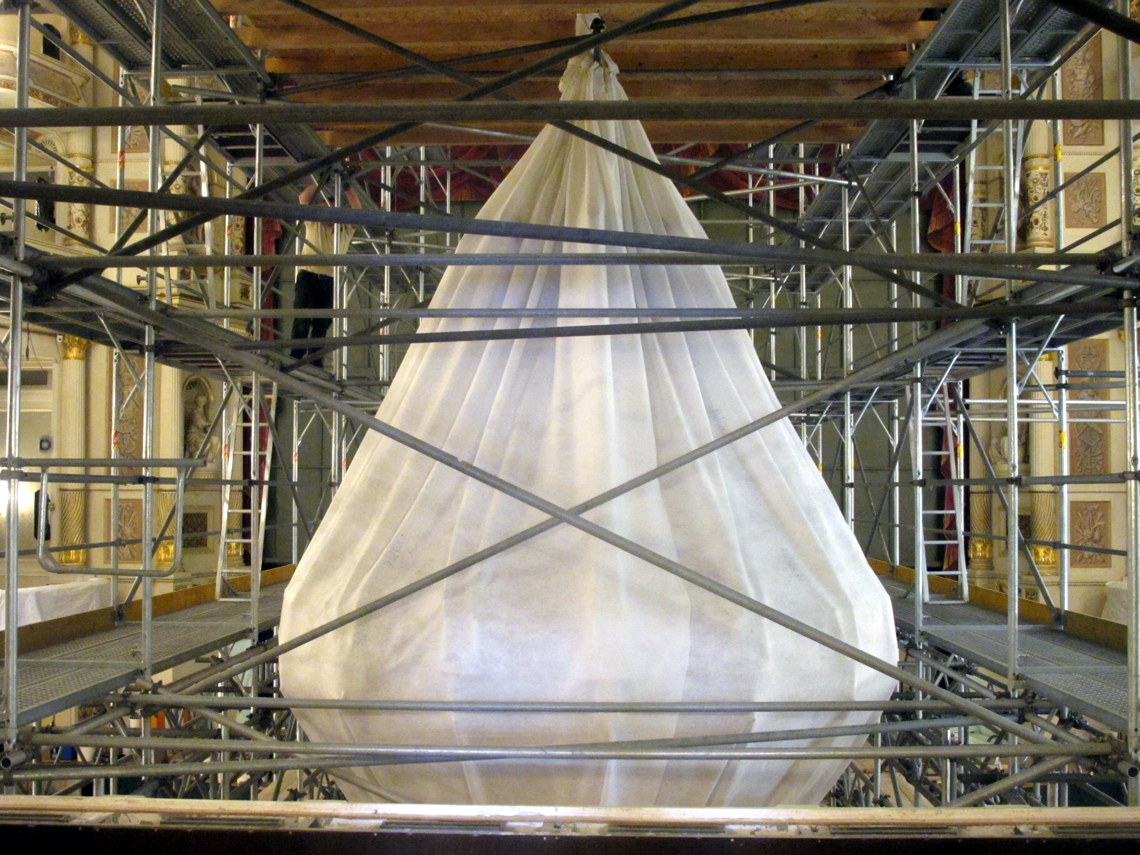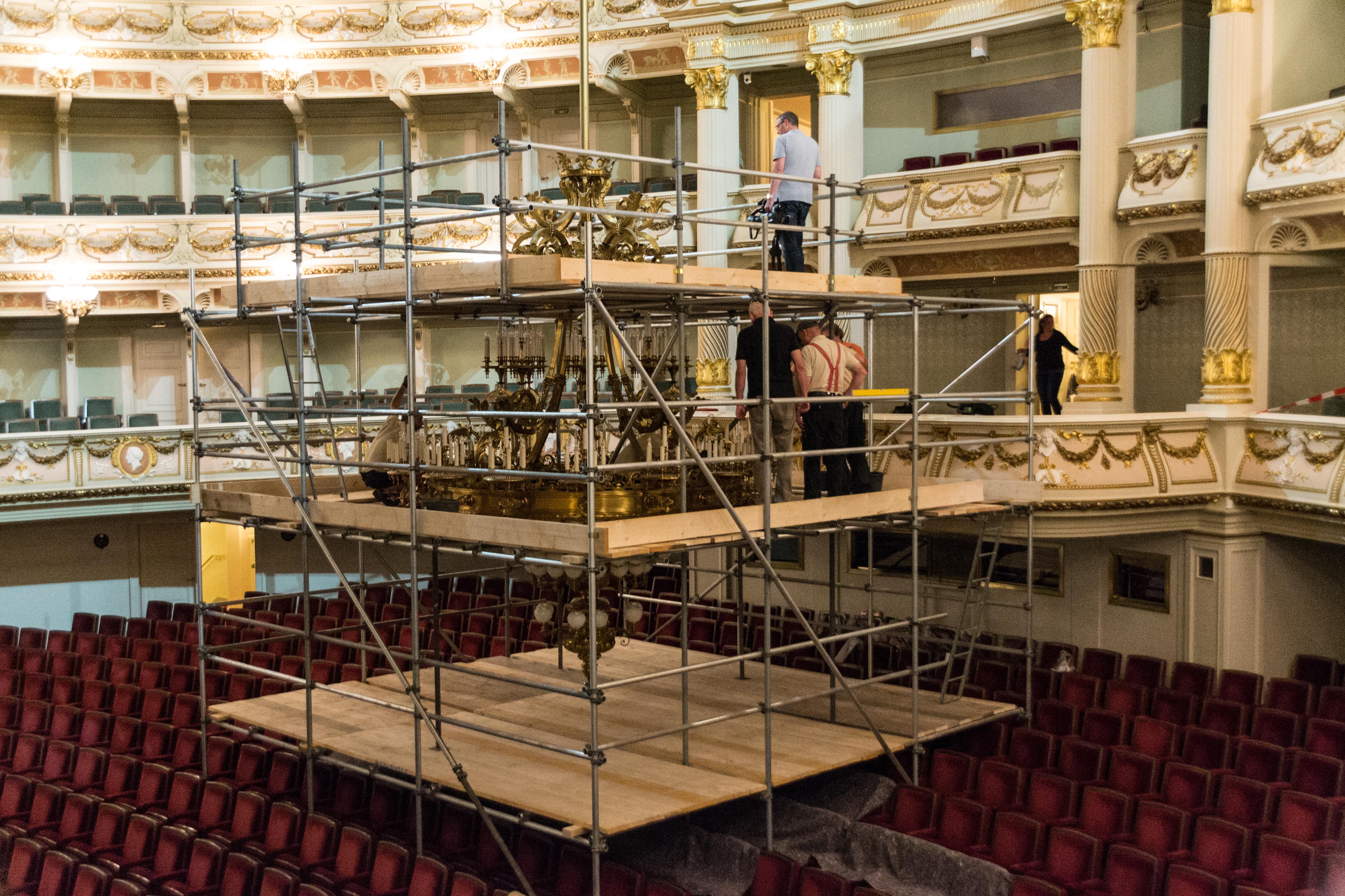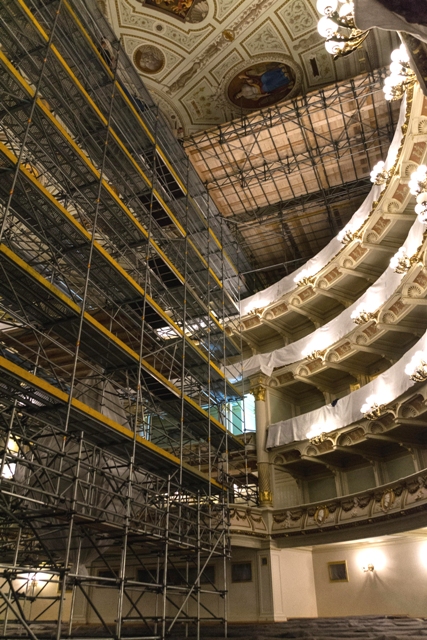 systemungebundene Stahl-Rohr-Kupplung Gerüstkonstruktion im Druckraum als Traggerüst durch die vorhandenen Stuhlöffnungen zur Aufnahme der Gitterträgerbrücken. Ausbau und Erweiterung dieser mit einem systemgebundenen, ausgeschraubten Leergerüst bis ca.2,00m unter die Decke zur Aufnahme von fahrbaren und festen Gerüstebenen mit umlaufenden, dreiteiligem Seitenschutz auf diesem. Stahl-Rohr Konstruktionen, auf dem 4.Rang umlaufend, als Raumgerüst mit Plattform, zum Anpassen der Kubatur und zur Aufnahme der fahrbaren Plattformen. Der Zugang zu den Gerüstebenen erfolgt über den 4. und 5.Rang. Im Bereich der Mittelloge wird die Konstruktion erweitert und ein Leitergang vorgesehen. Die systemungebundenen, fahrbaren Gerüsteben aus einer ausgeschraubten Gitterträgerkonstruktion und einem dichten, doppeltem Holzbelag werden zusätzlich mit Hartfaserplatten verklebt, ausgelegt.