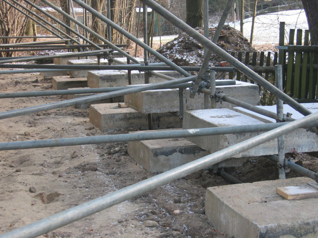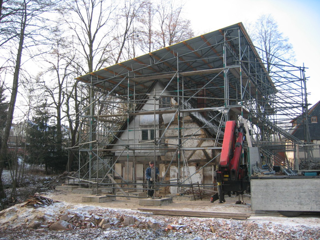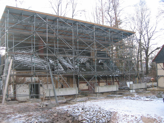 Schwenkfeldhaus Berthelsdorf Systemgebundenes Fassadengerüst mit systemungebundenen, ballastierten Stützgerüst, systemungebundene Pultdachkonstruktion, Wetterschutzeinhausungen Zurück Weiter